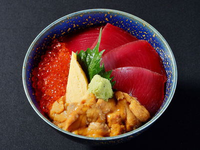 An exquisite seafood bowl generously piled high with the highest quality fresh seafood from Toyosu Market.
